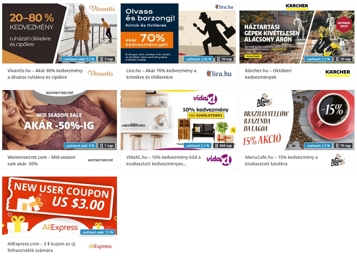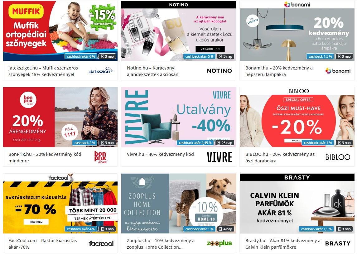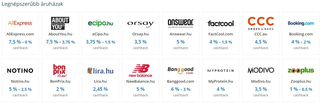 A Refundo.hu minden áruháznál megtalálja az információkat a pénzvisszatérítésről (megadott százalék a megrendelés árából vagy rögzített összeg).