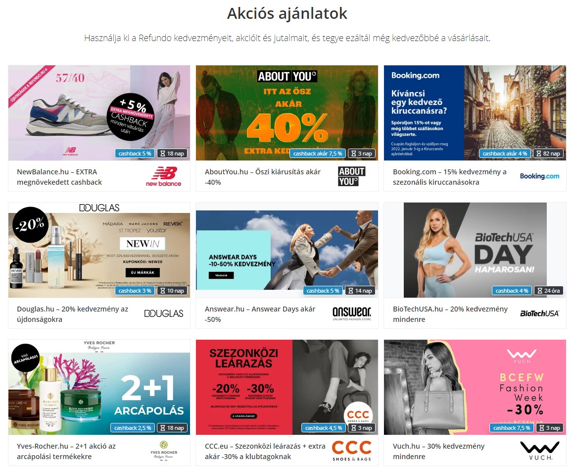 A Refundo.hu egy magyar nyelven is elérhető cashback oldal, amely több száz különböző webshop esetén kínál pénzvisszatérítési lehetőséget. Ha szoktál online vásárolni, érdemes megnézni, hogy az általad használt webshopokat támogatja-e, mert így olyan plusz kedvezményhez juthatsz, ami a legtöbb esetben minden más kuponnal és kedvezménnyel összevonható. Ezeket a kedvezményeket utólag írják jóvá, és az 1.300 Ft-os kifizetési limit elérése után utalják át az általad megadott bankszámlára.